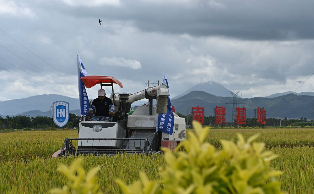 5月6日,在三亚市崖州区(坝头)南繁公共试验基地试验示范点拍摄的稻田,工作人员操作收割机。新华社记者 杨冠宇 摄